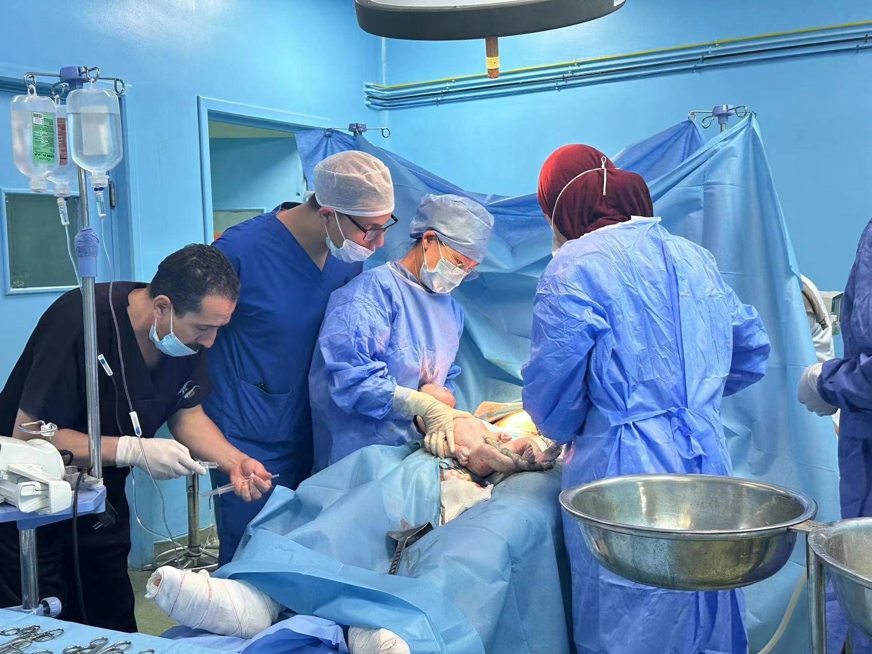 第27批援阿尔及利亚巴特纳分队队长龙青云(右二)给全身烧伤面积达95%的孕妇做剖宫产。