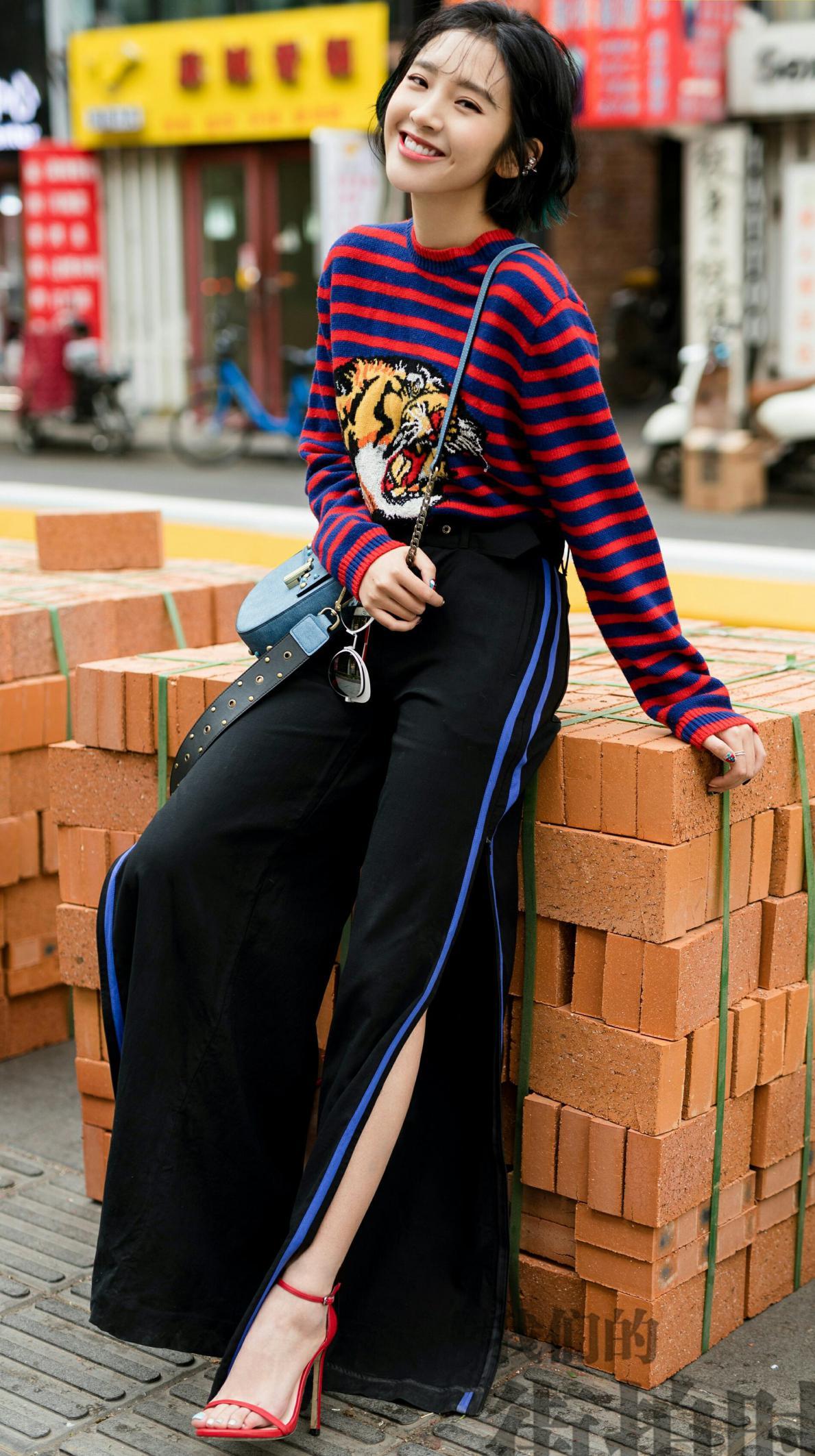 这一套造型就非常的日常百搭了,几乎人人都能驾驭,上半身是一件红蓝交织的条纹针织衫,红蓝色彩对比强烈,下半身搭配了一条高腰阔腿裤,蓝色的竖条纹也从视觉效果上拉长了腿部比例,高开叉的设计相当个性,显得腿部线条更加修长纤细。