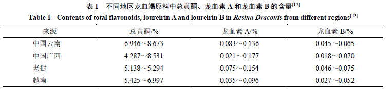 不同地域来源的龙血竭中主要成分含量存在一定差异,见表1。此前,有研究系统地对来源于中国广西、中国云南和老挝、越南4个产地多批次龙血竭药材中总黄酮、龙血素A及龙血素B的含量进行测定,发现三者含量相对较高的药材产地分别为中国云南、中国广西及老挝[12]。另采用代替对照品法测定发现中国云南、老挝产龙血竭药材中龙血素A与龙血素B含量比为(3~9)∶1,龙血素A含量较高但存在一定差异,使不同产地的龙血竭药材易于辨识[13]。