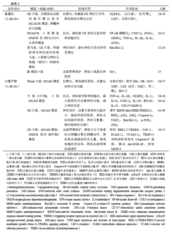 Khan等[65]对雄性SD大鼠(180~220 g)采用双侧颈总动脉闭塞30 min再灌注60 min制备脑损伤模型,随后ig给予紫檀茋(400 mg/kg)干预10 d,发现紫檀茋可显著改善脑I/R大鼠的神经行为学,降低脂质过氧化反应、谷胱甘肽、亚硝酸盐浓度,以及恢复CAT活性,显著减轻氧化损伤。进一步研究发现其机制与抑制NLRP3炎性小体和催化亚基gp91phox相关的氧化应激有关[28]。紫檀茋(20 μmol/L)能够增加过氧化氢(hydrogen peroxide,H2O2)处理后脊髓神经元细胞中的LC3-II蛋白质表达水平与自噬体数量,从而抑制细胞活性氧产生,发挥抗氧化应激作用[29]。体外细胞实验和在体缺血再灌注动物实验均显示紫檀茋具有较好的抗氧化应激能力。